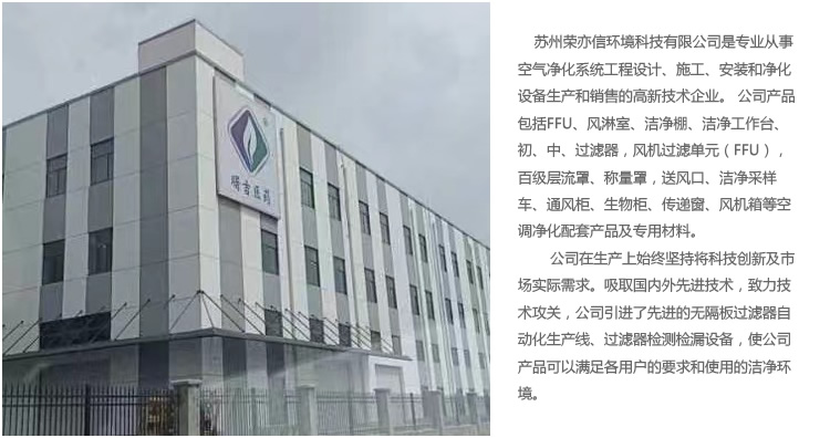 蘇州榮亦信環(huán)境科技有限公司是專業(yè)從事空氣凈化系統(tǒng)工程設(shè)計(jì)、施工、安裝和凈化設(shè)備生產(chǎn)和銷售的企業(yè)。 公司產(chǎn)品包括FFU、風(fēng)淋室、潔凈棚、潔凈工作臺(tái)、初、中、過(guò)濾器,風(fēng)機(jī)過(guò)濾單元(FFU),百級(jí)層流罩、稱量罩,送風(fēng)口、潔凈采樣車、通風(fēng)柜、生物安全柜、傳遞窗、風(fēng)機(jī)箱等空調(diào)凈化配套產(chǎn)品及專用材料。公司在生產(chǎn)上始終堅(jiān)持將科技創(chuàng)新及市場(chǎng)實(shí)際需求。吸取國(guó)內(nèi)外先進(jìn)技術(shù),致力技術(shù)攻關(guān),公司引進(jìn)了先進(jìn)的無(wú)隔板過(guò)濾器自動(dòng)化生產(chǎn)線、過(guò)濾器檢測(cè)檢漏設(shè)備,使公司產(chǎn)品可以滿足各用戶的要求和使用的潔凈環(huán)境。公司擁有技術(shù)專業(yè)的科技人員,專業(yè)的設(shè)備制作人員,工程安裝施工人員,我公司不斷創(chuàng)新,不斷發(fā)展,致力于空調(diào)凈化系統(tǒng)的新設(shè)備、新技術(shù)的研發(fā)和生產(chǎn)。